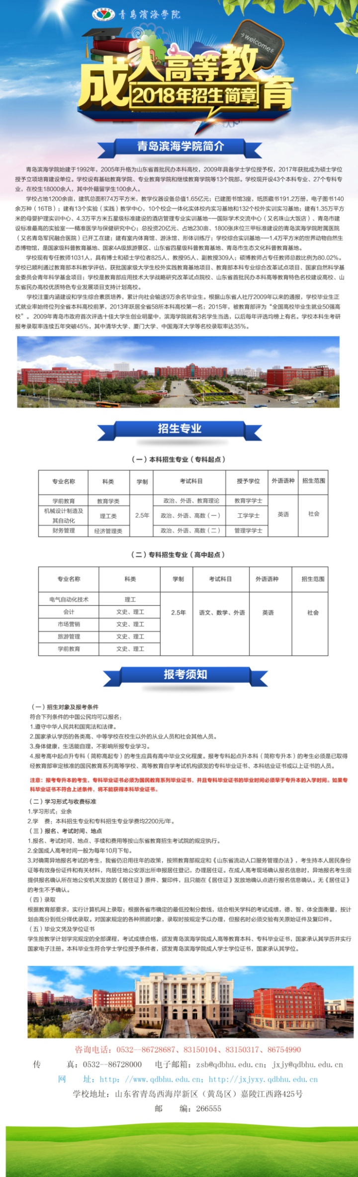 青岛滨海学院成人高等教育2018年招生简章